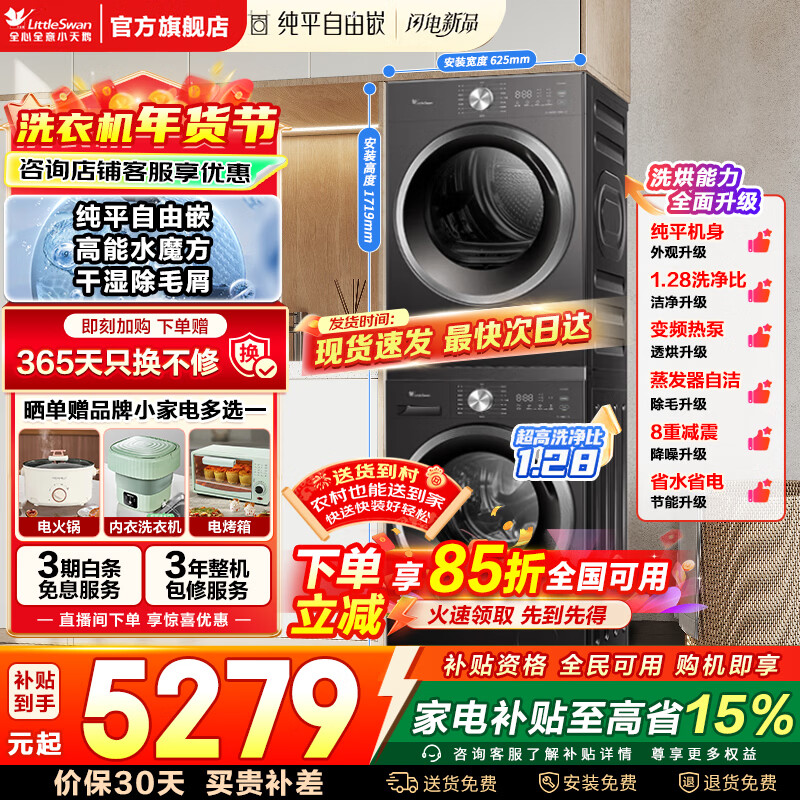 旗舰店小天鹅(LittleSwan)洗烘套装 全自动滚筒洗衣机+热泵烘干机 纯平自由嵌 水魔方干湿除毛屑低温柔烘 以旧换新家电补贴 【628T+628T】高能水魔方+变频热泵 洗烘套装