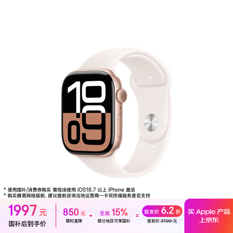 自营Apple/苹果 Watch Series 10 智能手表GPS款46毫米玫瑰金色铝金属表壳淡桃粉色运动型表带S/M MX293CH/B