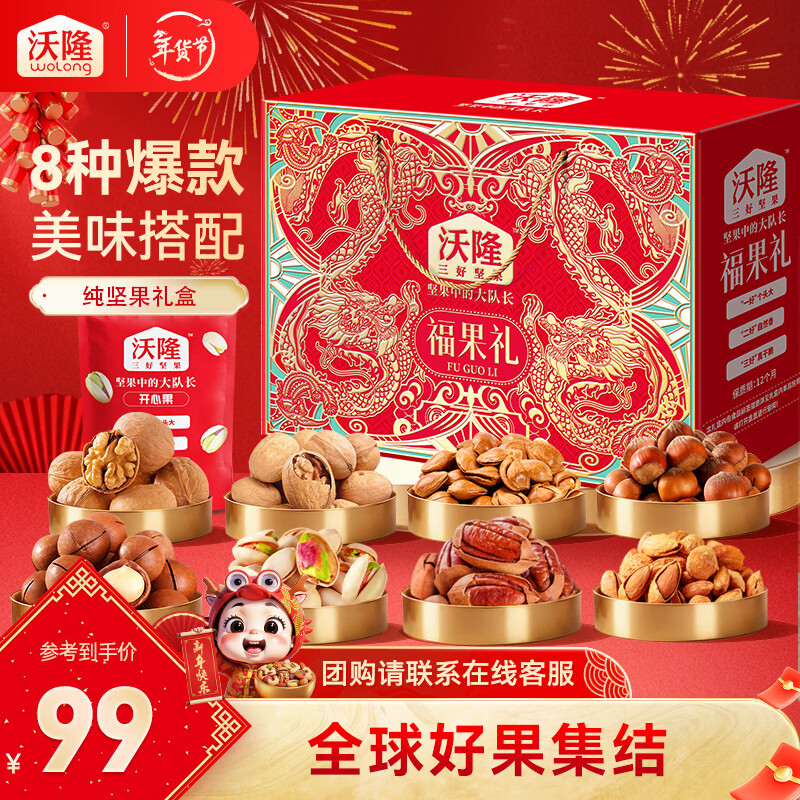百亿补贴沃隆高端坚果礼盒每日坚果炒货干果年货礼盒送礼团购混合零食大礼包 【8袋纯坚果】1220g福果礼