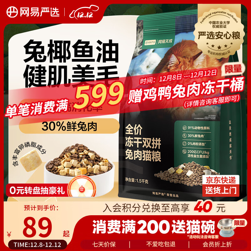 自营网易严选全价冻干双拼兔肉猫粮 成幼猫鲜肉助消化长肉亮毛改善掉毛1.5kg