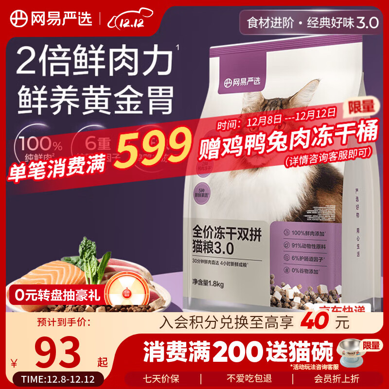 自营网易严选全价冻干双拼猫猫粮3.0款 主粮成幼猫高鲜肉鸡鸭无谷护肠胃1.8kg