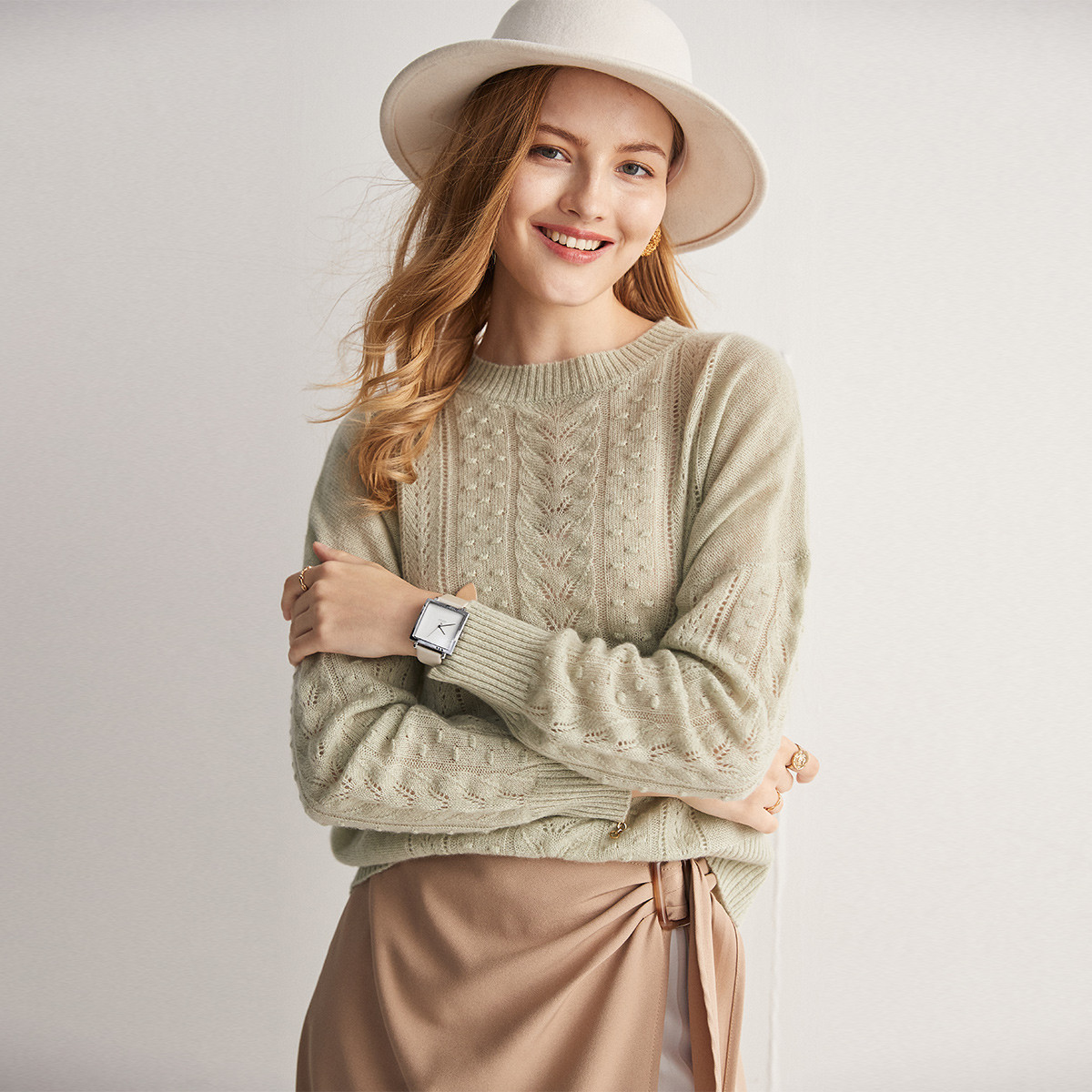 100%山羊绒】秋冬镂空绞花设计淑女宽松气质针织羊绒衫女