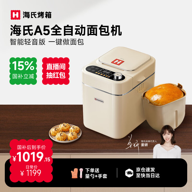 旗舰店海氏(Hauswirt)A5全自动面包机家用多功能智能早餐和面发酵烘焙烤吐司三明治机 奶米白【国家补贴】