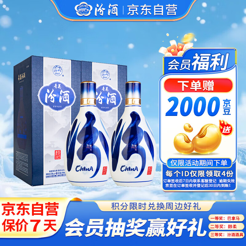 自营汾酒 青花20 清香型白酒 53度 500ml*2 双瓶含礼袋 宴请礼赠 升级版