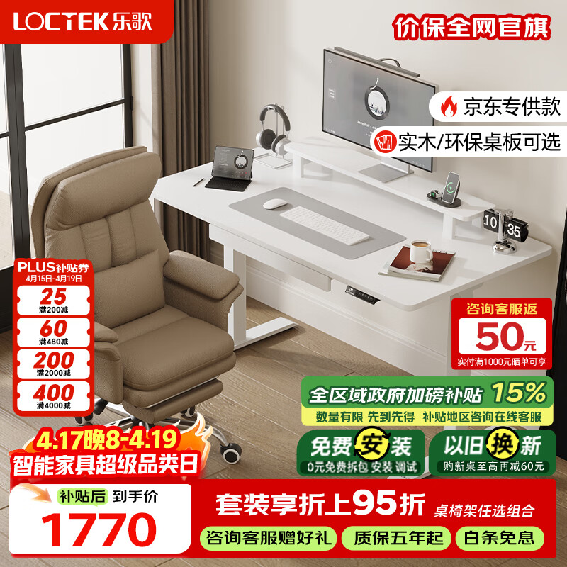 自营乐歌电动升降桌电脑桌双电机站立办公家用写字书桌 E3/1.4m雅白色套装