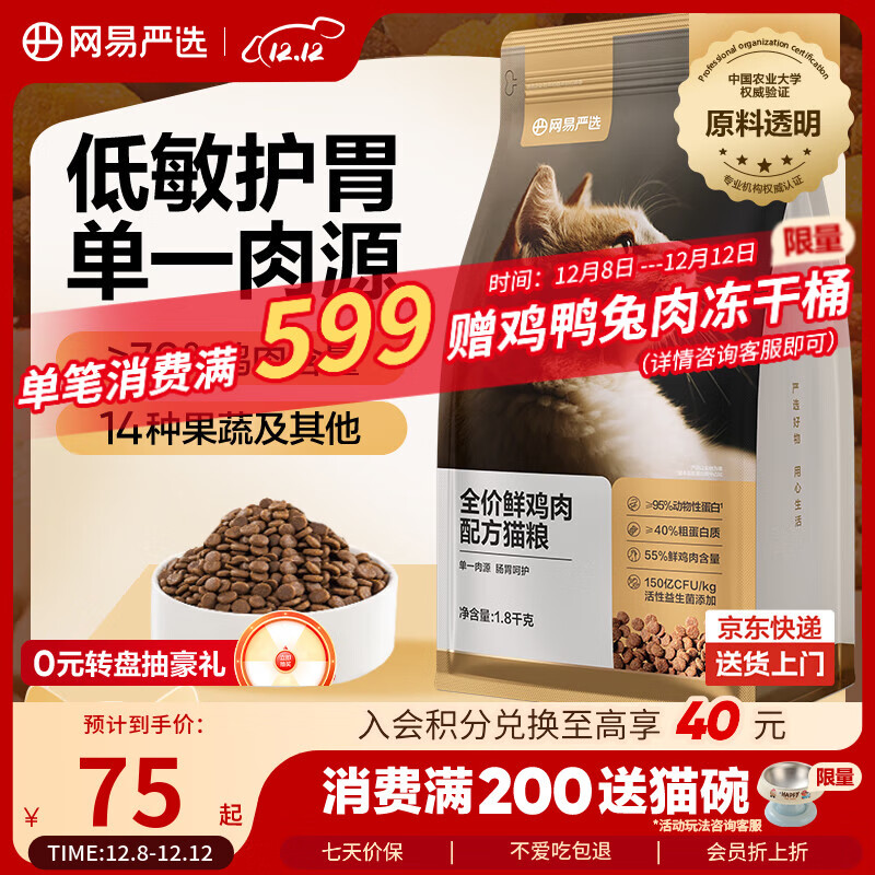 自营网易严选全价鲜鸡肉猫粮 成幼猫粮单一肉源无谷益生菌低敏护肠胃增肌1.8kg