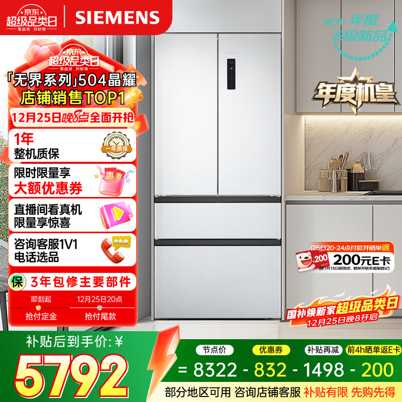 自营西门子(SIEMENS)【年度机皇】无界504L法式多门冰箱 501升级款超薄嵌入大容量双循环一级能效KF89CE163C 国家补贴