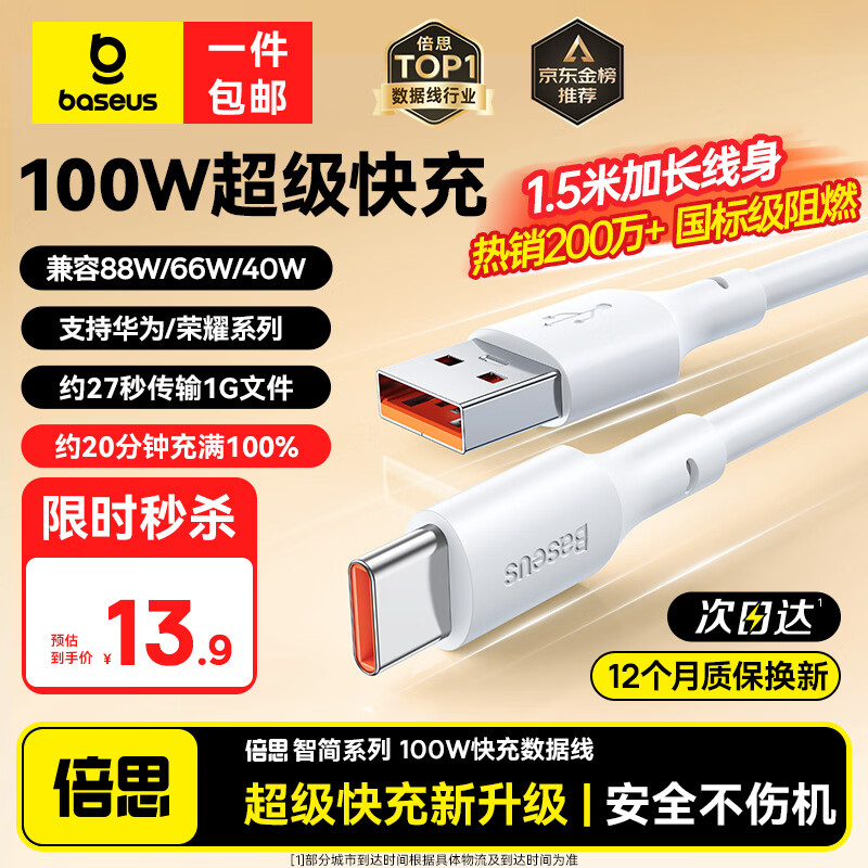 自营倍思Type-c数据线6A超级快充100W/88W/66W/40W华为荣耀充电线适用小米安卓手机平板Pura80/Mate70/60