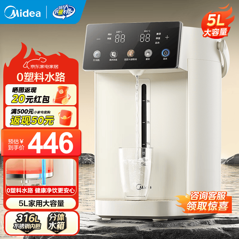 旗舰店美的(Midea)小魔方电热水瓶 316L不锈钢电水瓶 5L大容量家用烧水壶 保温饮水机恒温电水壶 0塑料水路电热水壶 5L 【一体无缝内胆】30Wpro