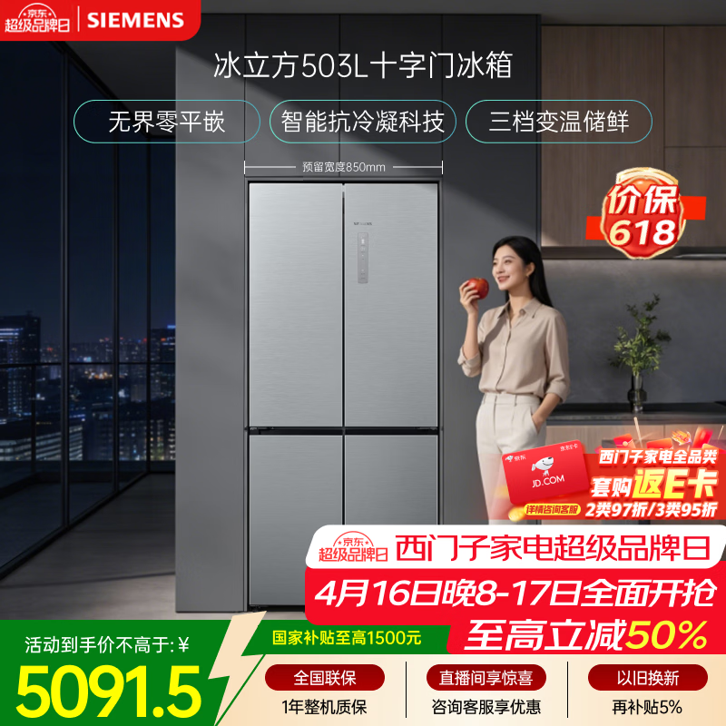 自营西门子(SIEMENS)冰立方503L十字门冰箱大容量 智能抗冷凝 平嵌 超薄嵌入式一级能效KC88EA639C 国家补贴