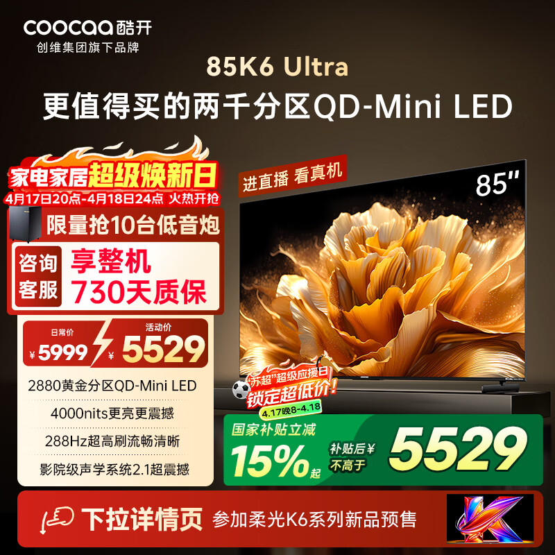 自营酷开创维电视K6 Ultra 85英寸 Mini LED量子点 2880分区 一级能效 国家补贴 国产液晶平板电视机85P8F
