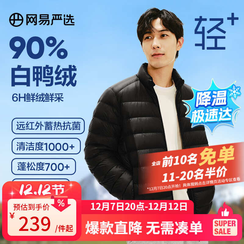 旗舰店网易严选【轻+7.0pro】90白鸭绒轻薄羽绒服排骨羽绒服云感保暖抗菌 立领*曜石黑 2XL