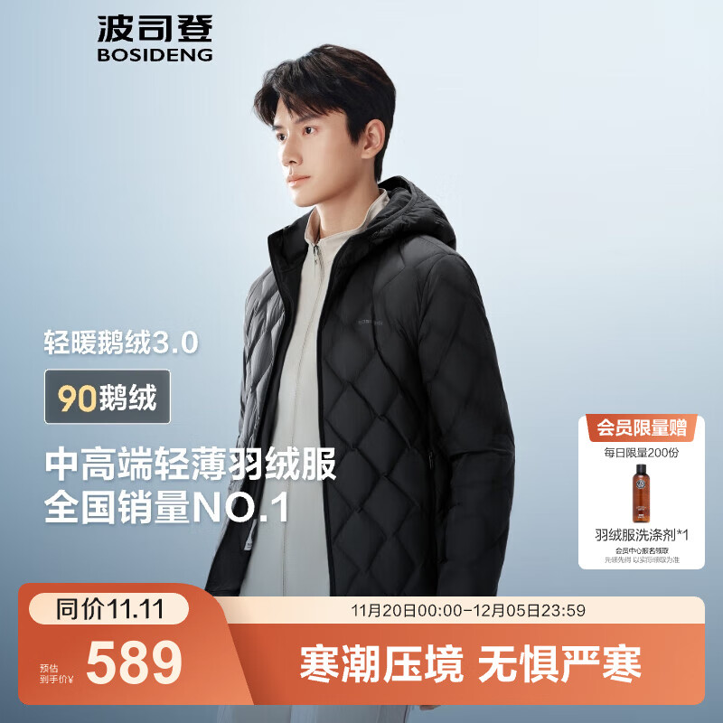 旗舰店波司登(BOSIDENG)25新款90鹅绒轻薄羽绒服男短款菱格纹连帽防风保暖外套B250131023 黑色8056-经典极简风 L 180/100A 体重约140-155斤