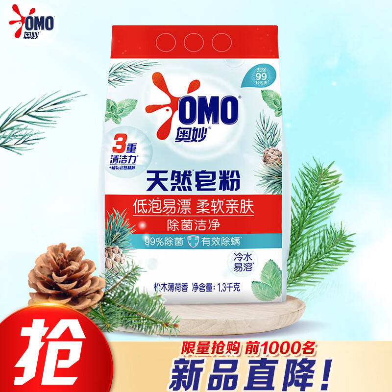 自营奥妙除菌洁净天然皂粉 1.3KG 天然皂基 低泡易漂