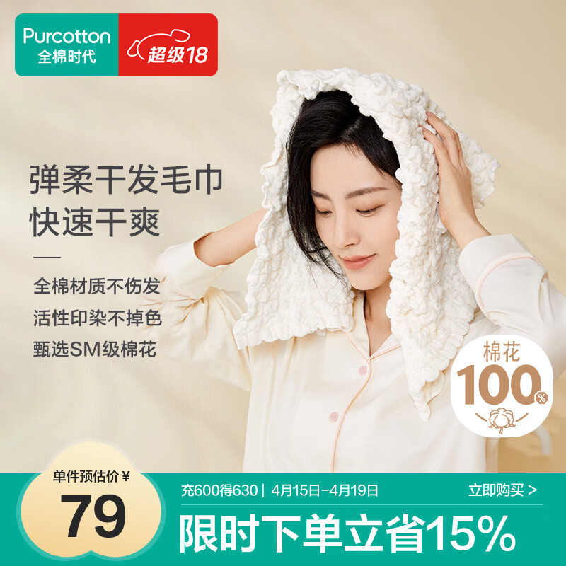 自营全棉时代干发毛巾蓬松吸水速干弹力软干发帽擦头发包头巾弹柔-米32×73cm