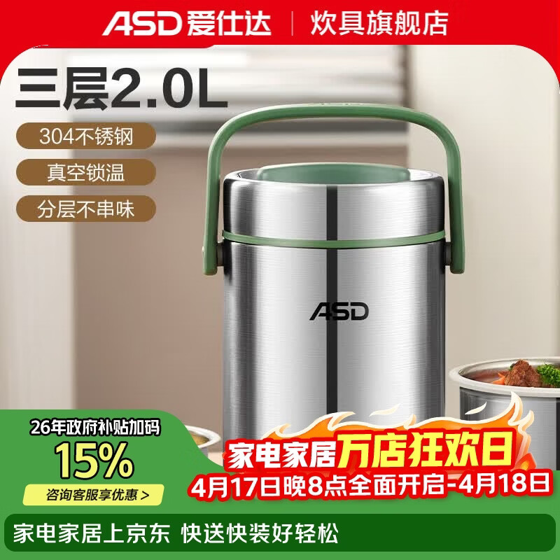 旗舰店爱仕达(ASD) 保温饭盒 304不锈钢大容量真空保温提锅三层成人上班学生便携桶 真空保温 2L