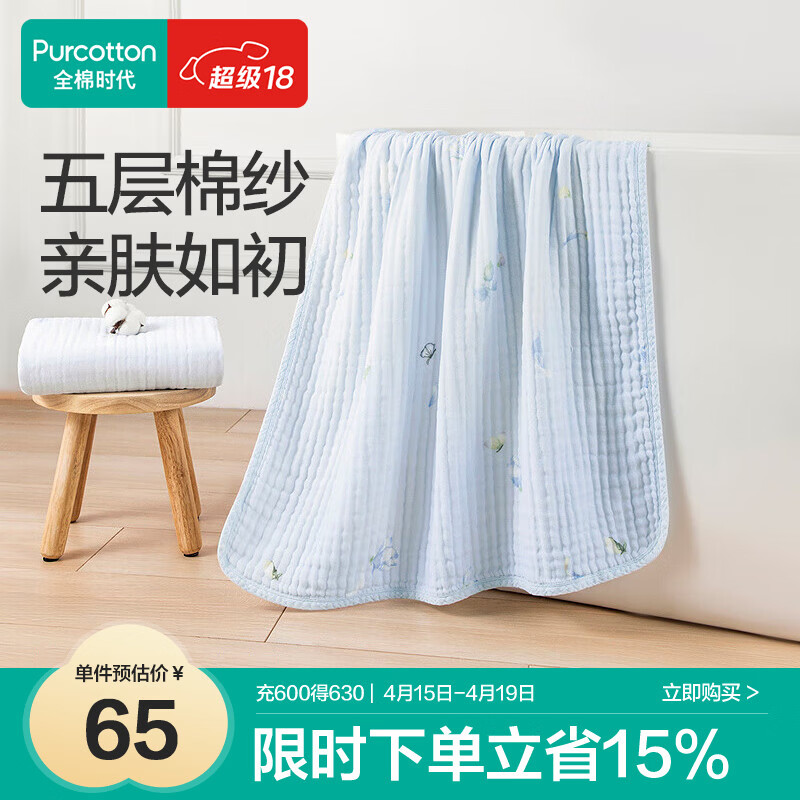 自营全棉时代毛巾五层水洗纱布家用纯棉加大吸水柔软速干 轻风棉棉蓝34*76cm