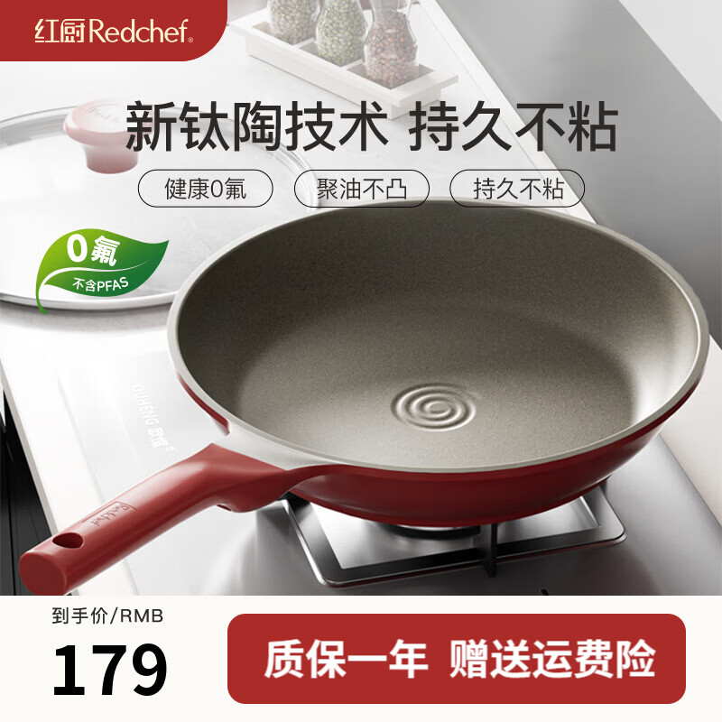 旗舰店红厨炒锅无涂层钛陶瓷不粘锅家用炒菜锅电磁炉燃气灶通用 【升级钛陶 持久不粘】带盖 30cm