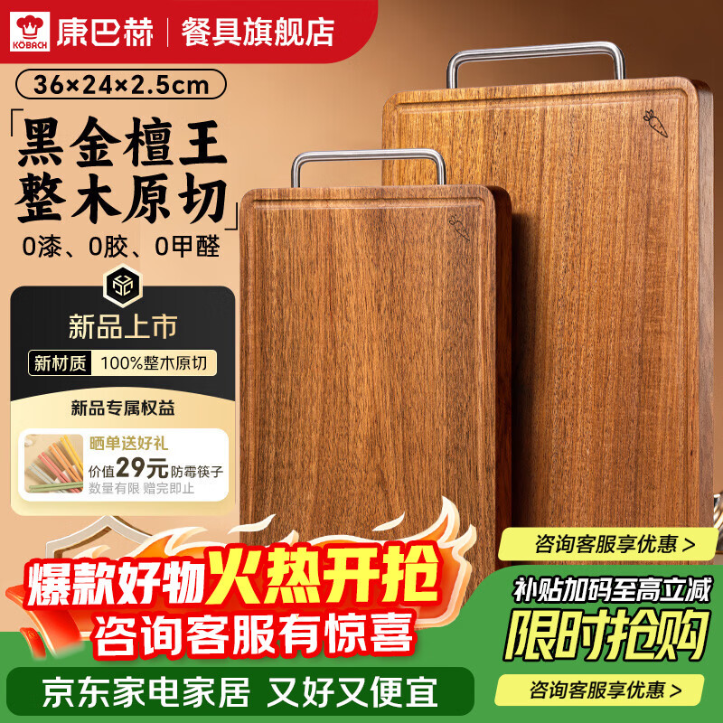 自营康巴赫菜板整木砧板抗菌防霉案板进口黑金檀木双面切菜板36*24cm