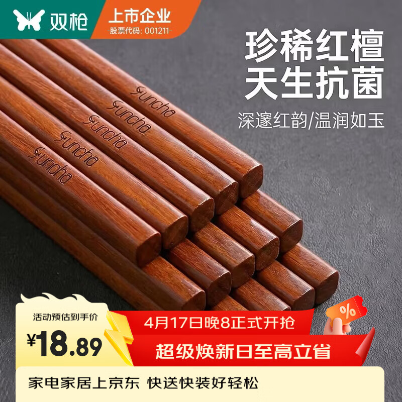 旗舰店双枪筷子家用高档实木质红檀木原木防滑耐高温家庭餐具无漆无蜡 【抗菌无漆无蜡】红檀木筷- 10双