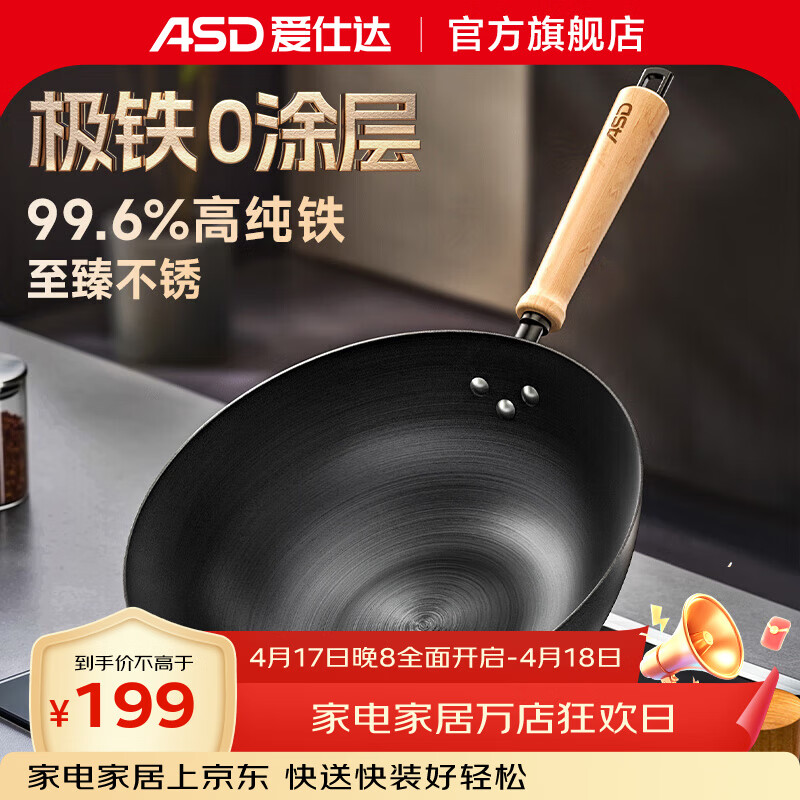 旗舰店爱仕达铁锅炒锅传统老式家用精铁爆炒无涂层极铁炒菜锅具燃气电磁炉通用 99.6%高纯锈不了铁锅 32cm