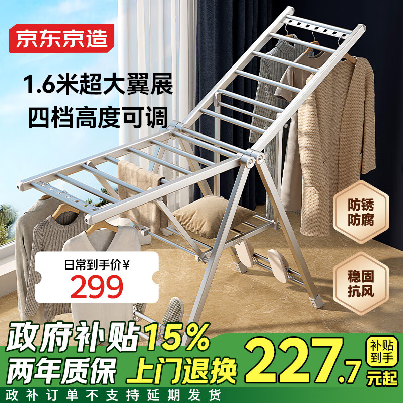 自营京东京造落地晾衣架 加厚铝合金折叠晾衣杆翼型 室内外阳台晒挂衣服