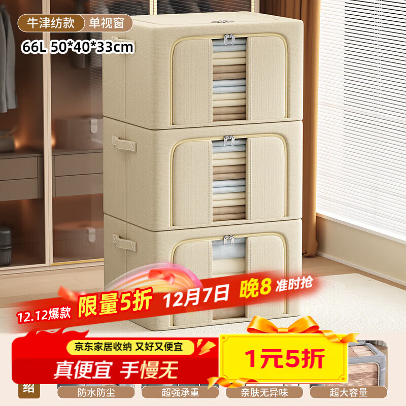 旗舰店纳份爱衣服收纳箱家用布艺装衣物整理盒折叠衣柜筐袋牛津布储物箱子神器 卡其色66L【3个装-单窗】50*40*33CM