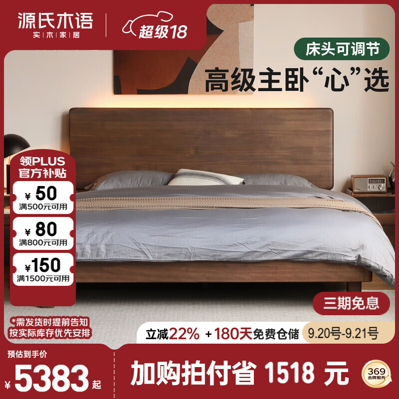自营源氏木语实木床高床头大板床黑胡桃木大床家用悬浮床床头可调大板床1.8*2m
