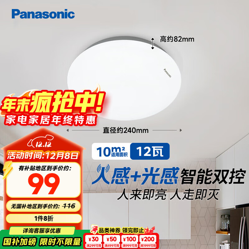 自营松下(Panasonic)吸顶灯走廊灯 LED人体感应灯具玄关卧室厨房 圆形12瓦