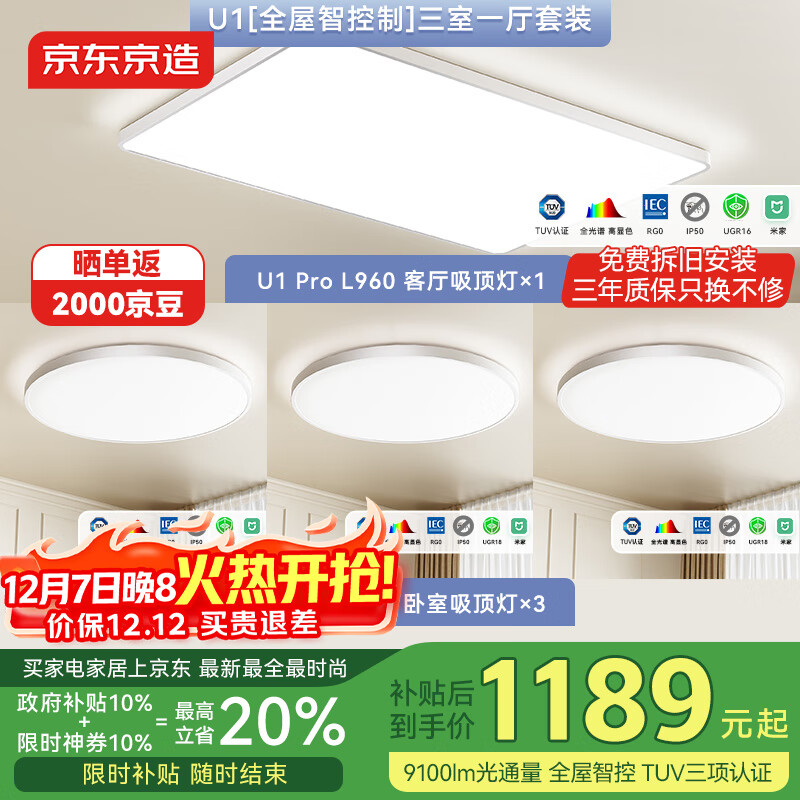 自营京东京造U1吸顶灯【全屋智控】三室一厅套装 全光谱智能米家护眼灯客厅灯