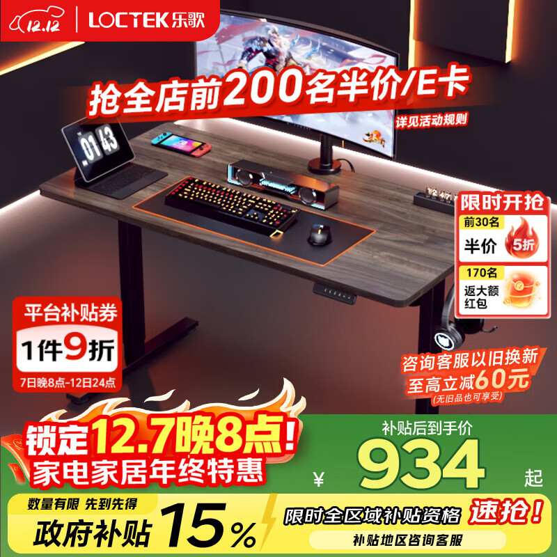 自营乐歌【政府补贴】黑武士电竞桌电动升降电脑桌办公灰木纹1.2M