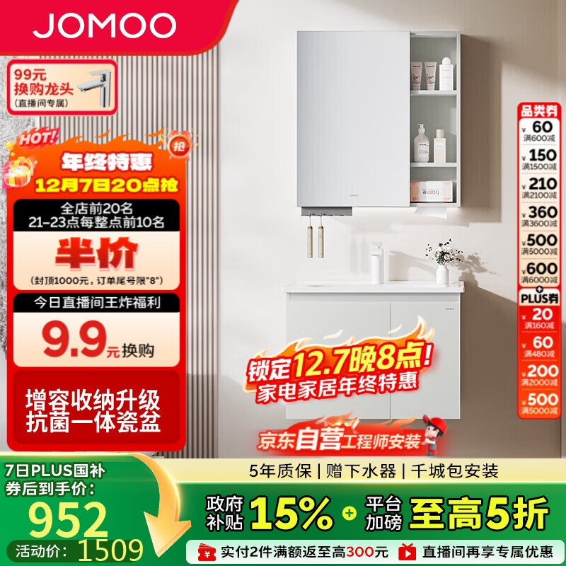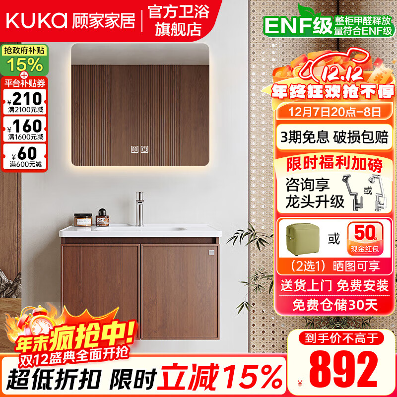 旗舰店顾家家居中古风浴室柜陶瓷一体盆洗手洗脸盆柜组合洗漱台卫浴柜G-06955 60cm|智能镜片|照明除雾