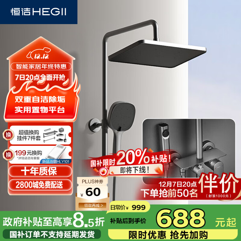 自营恒洁(HEGII)淋浴花洒套装 铜合金主体智能自动除垢花洒全套HMF951-333B-SH