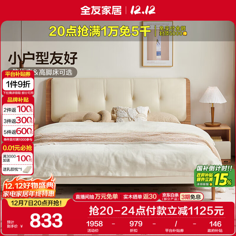 自营全友家居 板式床1.5x2米原木奶油风实木床脚皮艺软包靠背主卧室双人床