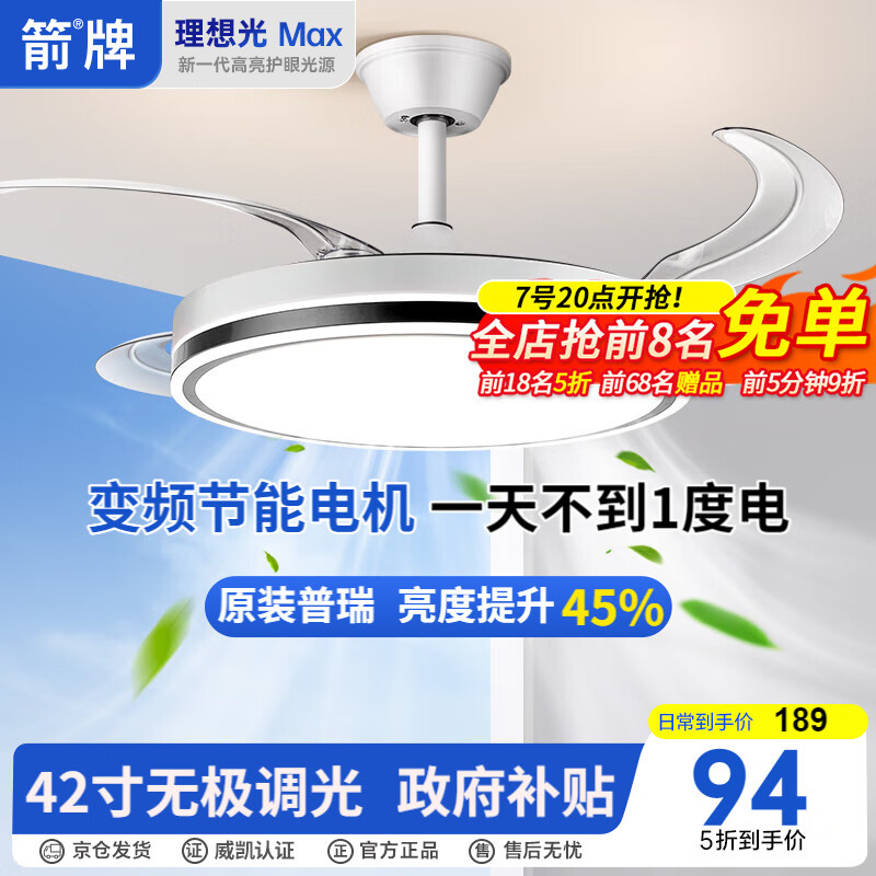 自营ARROW箭牌 隐形风扇灯大风力家用变频客厅吊扇灯餐厅灯【包安装】