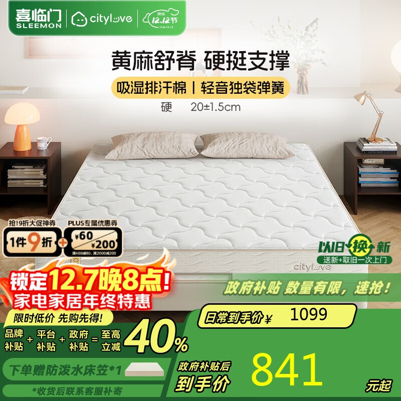 自营城市爱情喜临门黄麻床垫偏硬舒脊床垫1.5x2米独立弹簧床垫席梦思 偏硬