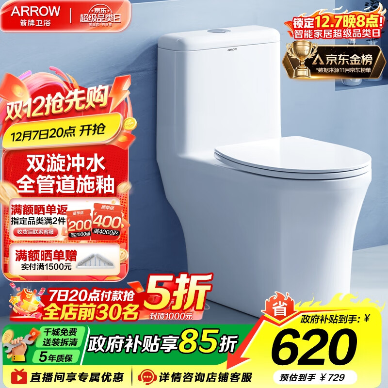 旗舰店箭牌(ARROW)卫浴大冲力喷射虹吸式防臭节水马桶家用缓降盖板连体抽水坐便器 【金榜爆款】双龙卷漩吸12616 400mm