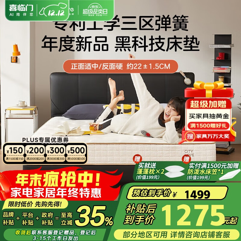 自营喜临门城市爱情抗菌防螨专利工学三区弹簧床垫大白plus 1.8x2米软硬适中