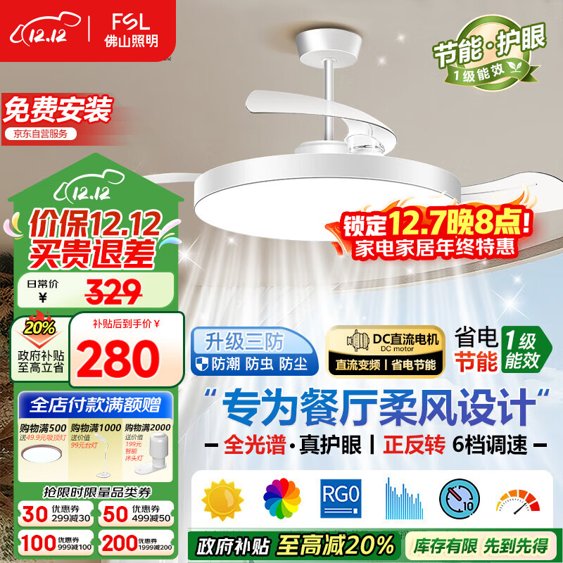 自营FSL佛山照明三防风扇灯吊扇餐厅灯客厅led灯饰蔚蓝白42寸56W包安装