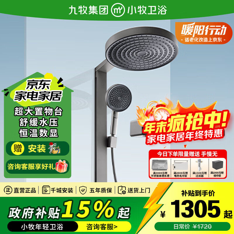 旗舰店九牧(JOMOO)淋浴花洒全套装 小牧卫浴 增压软管喷头 置物除垢 淋浴器 8100枪灰-恒温数显+增压波纹水花