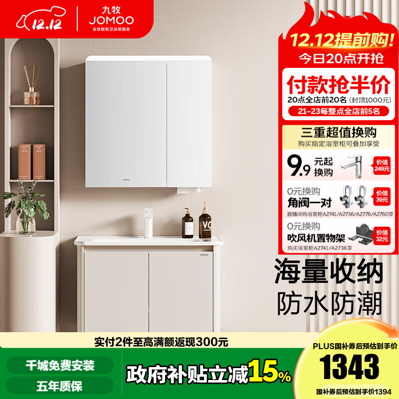 旗舰店九牧(JOMOO)浴室柜洗脸盆柜一体盆陶瓷铝合金洗手盆柜组合洗漱盆无龙头A2736 奶油白 智能 感应灯|防潮 80cm