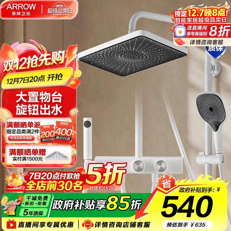 旗舰店箭牌(ARROW)大顶喷旋钮置物花洒套装四功能淋浴花洒全套冷热增压淋浴花洒 月光白-四功能花洒34142ZWP