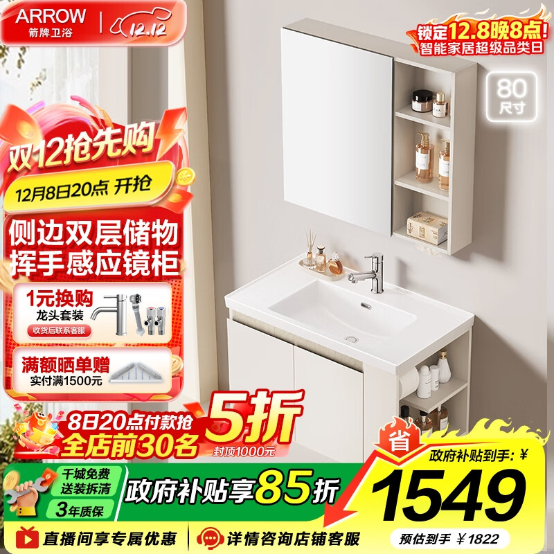 旗舰店箭牌(ARROW)奶油风自由系列浴室柜组合卫生间卫浴洗漱台洗手洗脸盆陶瓷一体盆 自由3.0【经典款】+侧收纳80cm,7天发