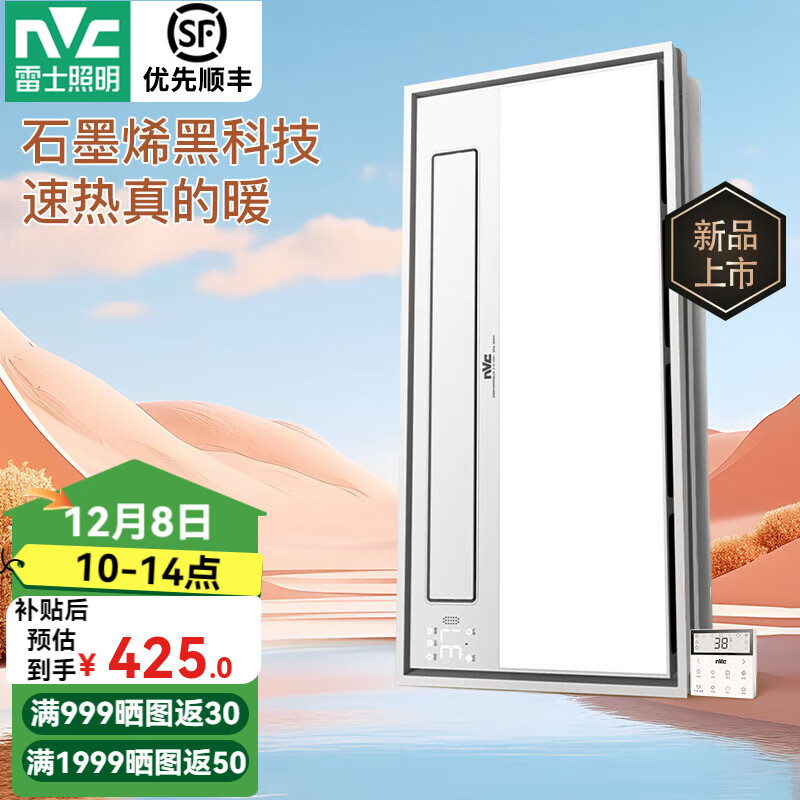 旗舰店雷士(NVC)风暖浴霸照明排气一体摆风速热浴室取暖器卫生间集成吊顶石墨烯 2800W|精准1°C控温|99%除菌