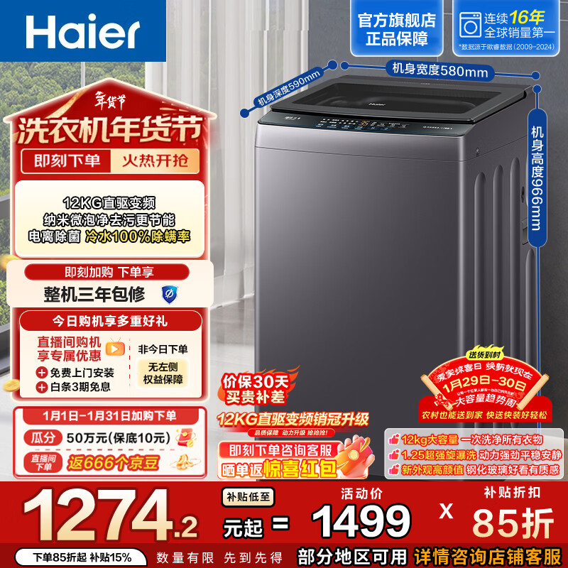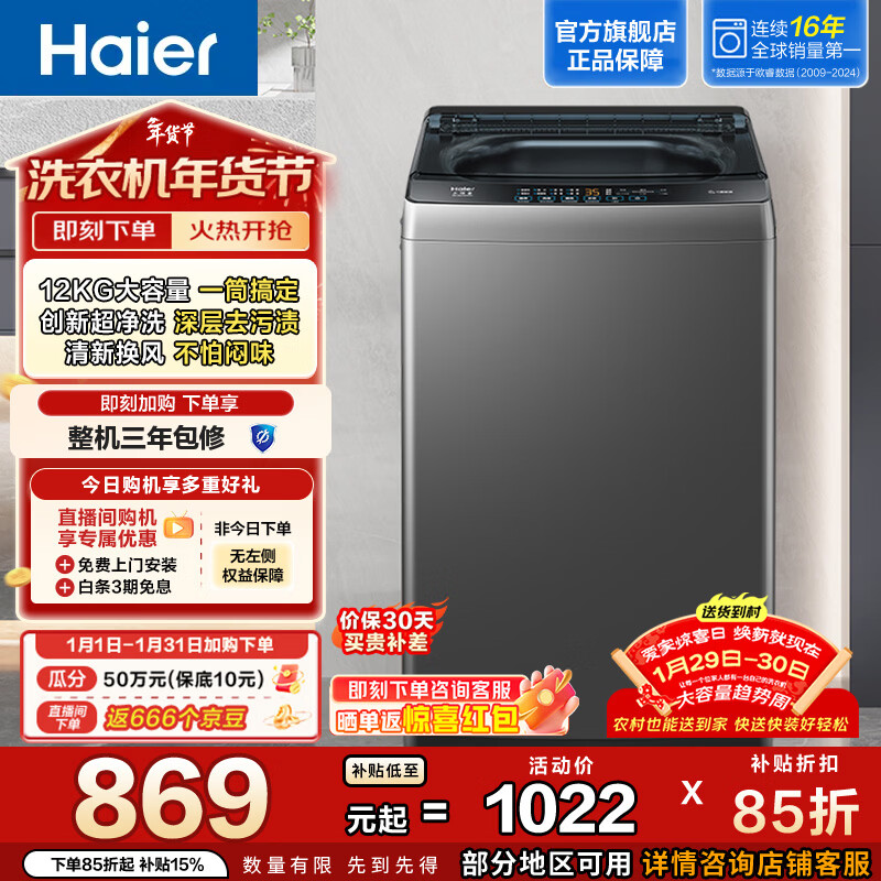 旗舰店海尔(Haier)波轮洗衣机全自动家用 12公斤 大容量洗脱一体机 以旧换新 除螨抗菌 去渍洗 EB120Z33Mate1