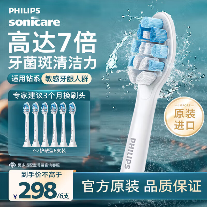 旗舰店飞利浦(PHILIPS)电动牙刷头钻石亮白型 官方原装适配钻石3/7/9系列配件刷柄清洁护龈亮白 6支 超值囤货-HX9033/67