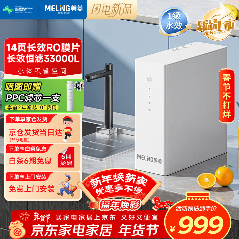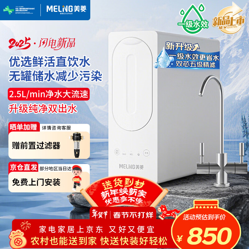 自营美菱(MeiLing)净水器家用净水机1000G大通量 9年RO反渗透双出水厨下式直饮机净饮机一级水效ML-2R1000-2505