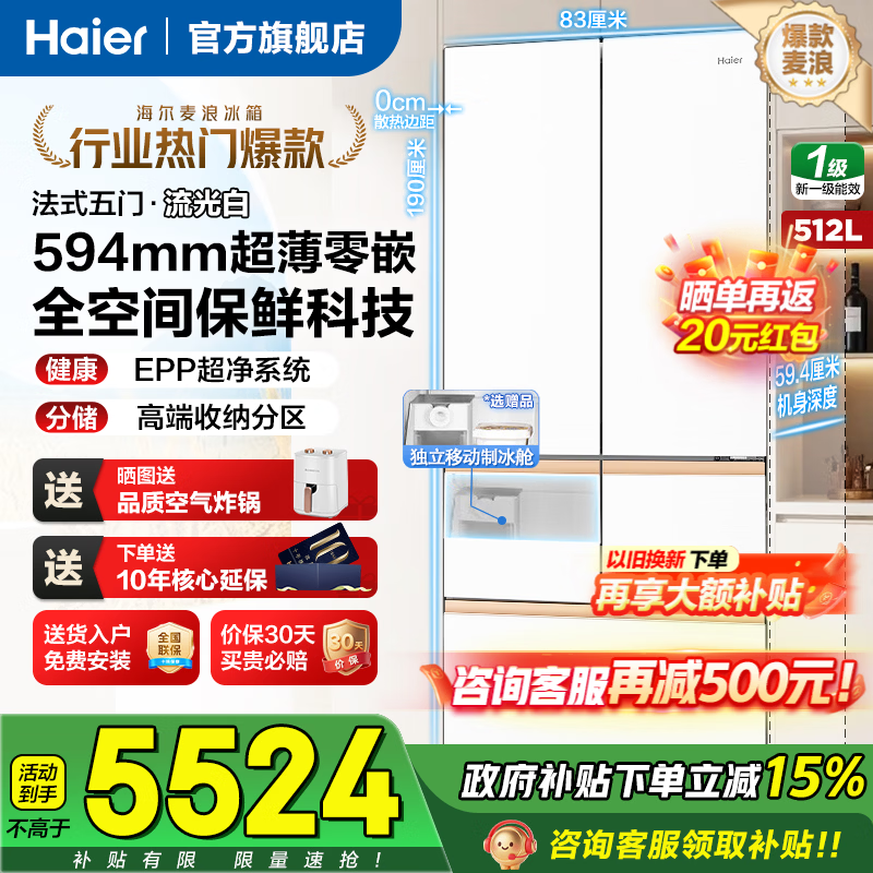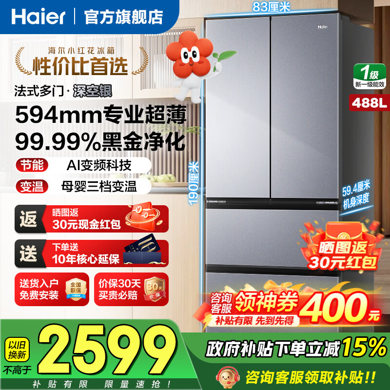 自营海尔(Haier)山茶花2.0「485升级」502L法式多门冰箱双系统双净化超薄零嵌制冰一级BCD-502WGHFDC4FBU1国家补贴