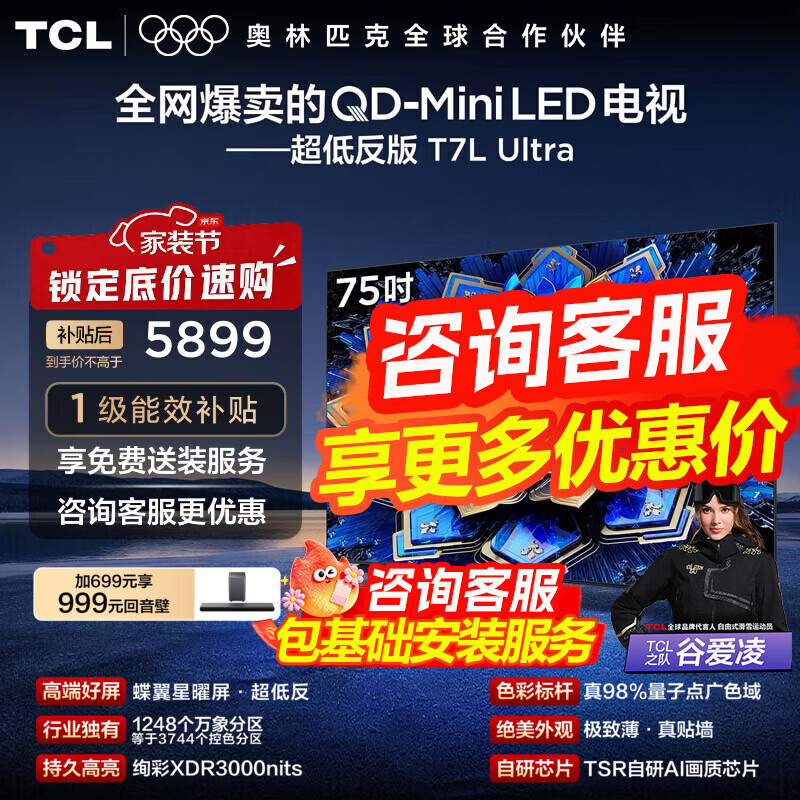 旗舰店TCL电视 75T7L Ultra 75英寸 QD-Mini LED 蝶翼星曜屏 万象分区 绚彩XDR 3000nits超薄电视机国家补贴 75英寸