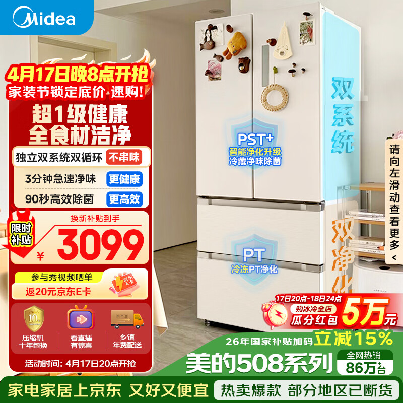 自营美的(Midea)508L法式四开门冰箱双系统循环一级能效除菌净味风冷大容量以旧换新白色BCD-508WTPZM(E) 国家补贴